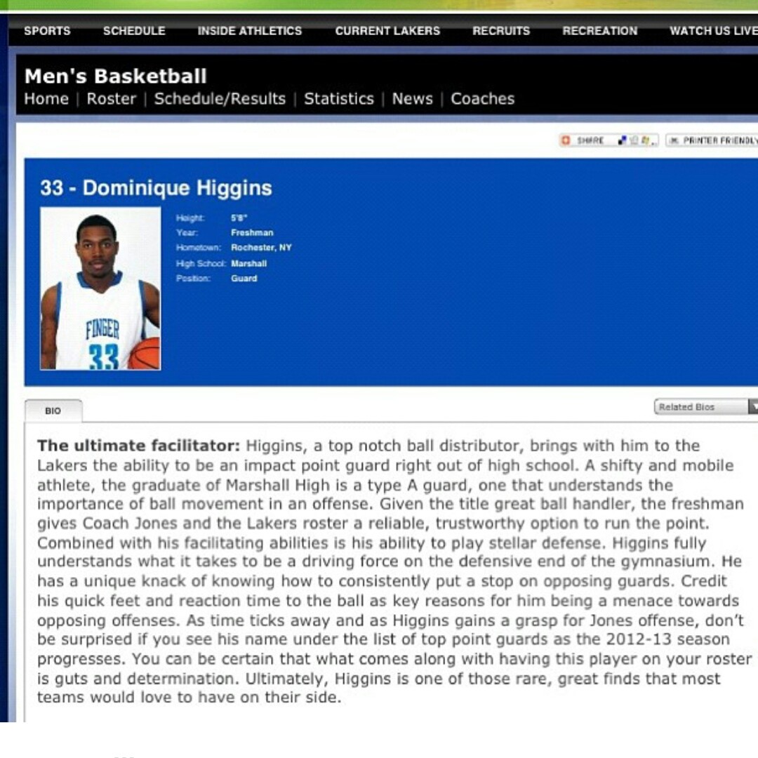 Finger Lakes Dominque Hinggins 19 points 11 assist against Onondaga community college 2-16-2013. Higgins hit a buzzer beater to win game 81-78 after trailing by 16 points.